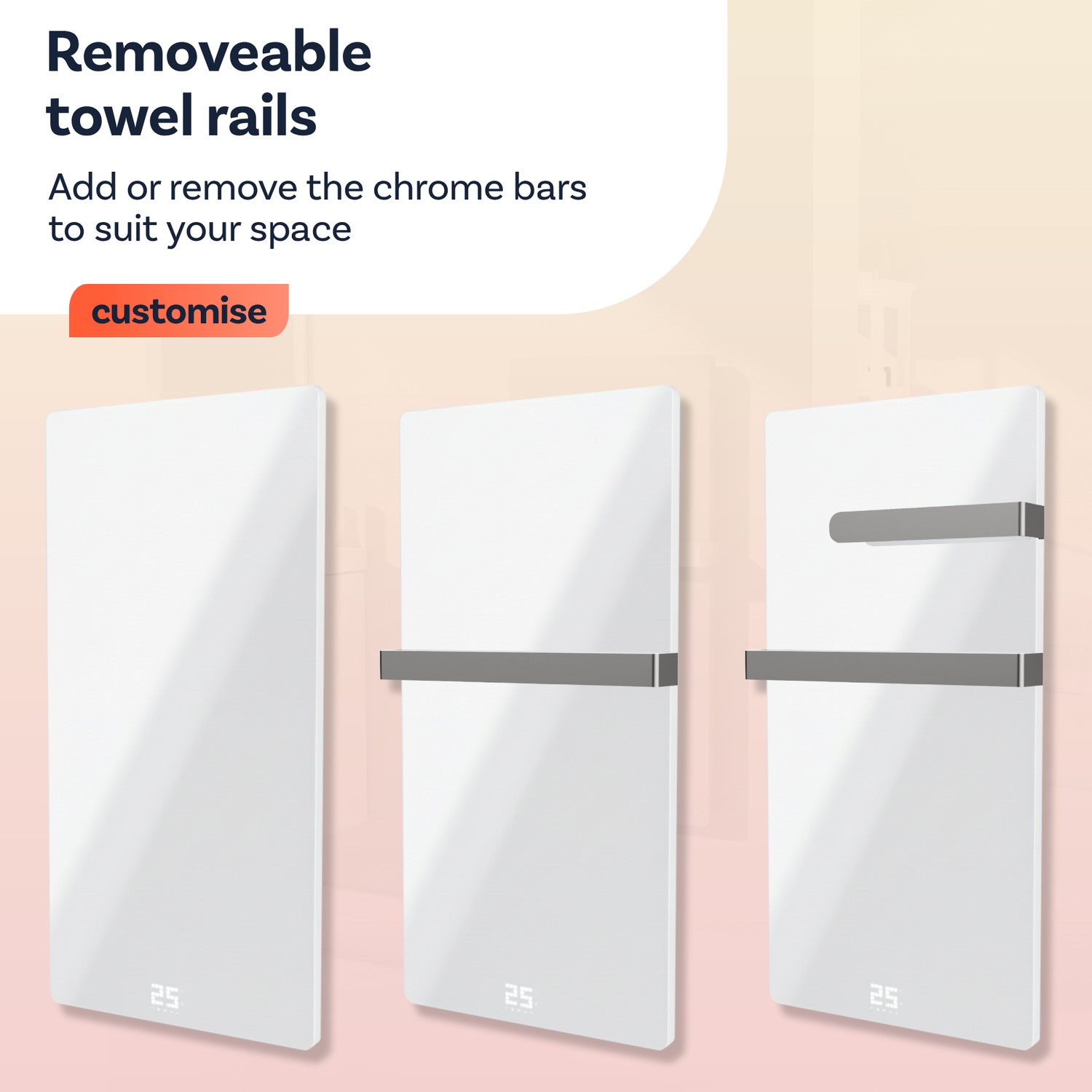 This infrared electric heated towel rail with thermostat brings comfort, convenience and clever features to your modern bathroom. It serves as both a modern heater for your space and a convenient towel rail, making sure that your towels are kept warm, dry, and fresh. It comes with 2 towel rails which can easily be added and removed to customise your space.